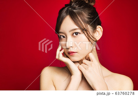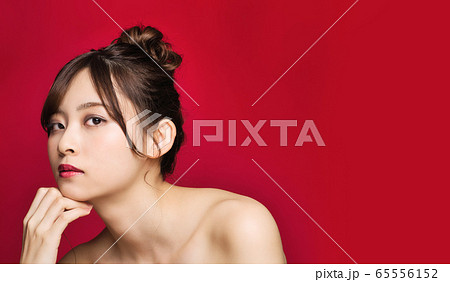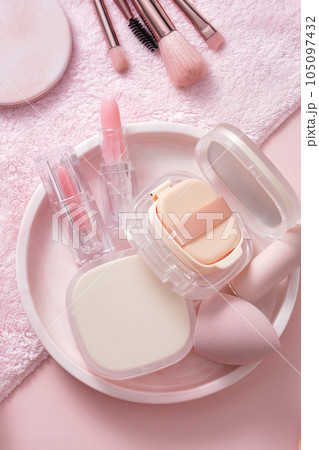 Photo for cosmetic advertising, makeup with cute concept. Powder, cushion, sponge, lipstick and powder brush decorated on round plated on pink background.