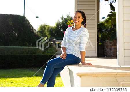 Outdoors, biracial woman in her late thirties sitting on porch steps, smiling warmly