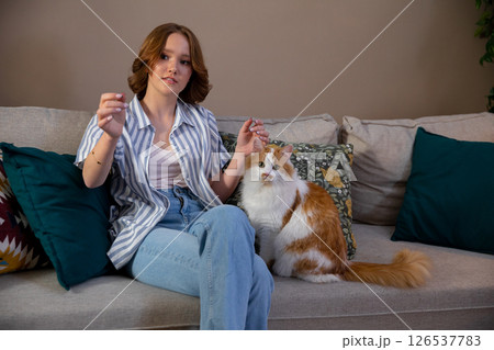A cozy and casual indoor scene featuring a woman relaxing on a couch with her cat near her