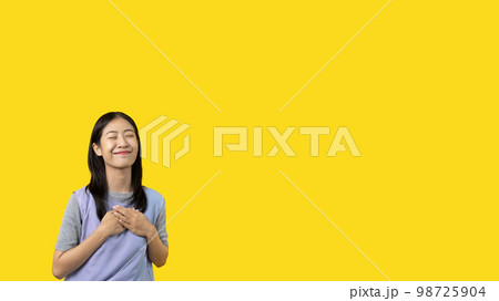 Asian woman smiling happily isolated on yellow background, Woman loves and rejoices herself, Contented, Pure love, Love myself, Proud of yourself, Self-made happiness, Optimism.