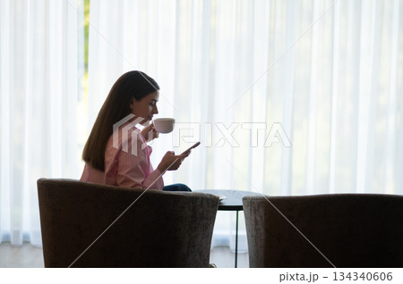 Relaxing by window, woman holding coffee cup and enjoying sunlight at home