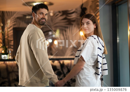 Beautiful young woman in white bath robe feeling enjoyed and confident