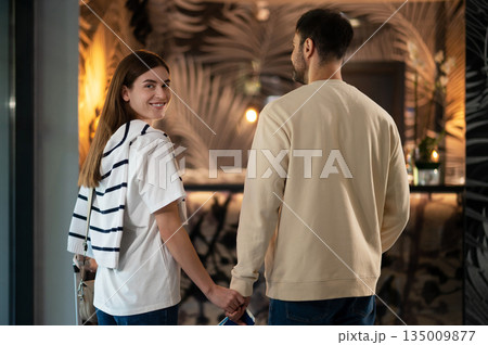 A woman is embracing a man from behind, both are laughing and enjoying each others company. The couple is sitting on a bed in a bright, well-lit room, indicating a sunny morning, copy space