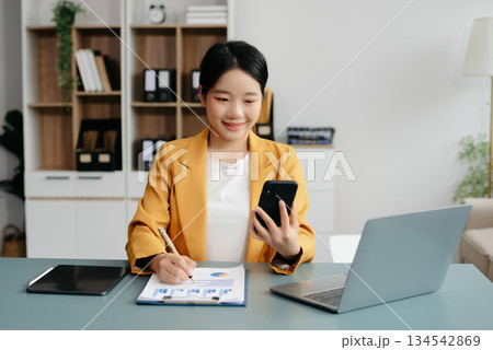Confident Asian woman with a smile standing holding notepad and tablet at the office.