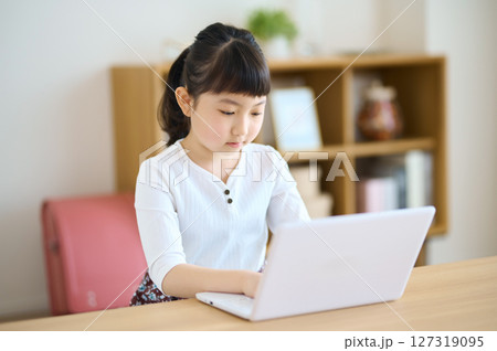 一個穿著夏裝的孩子在筆記本電腦周圍跳來跳去