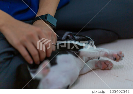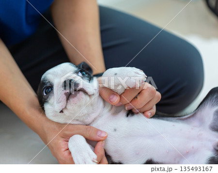 波士頓梗幼犬和女人