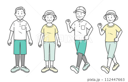 穿著短袖運動衫站立的老年男女全身插圖集