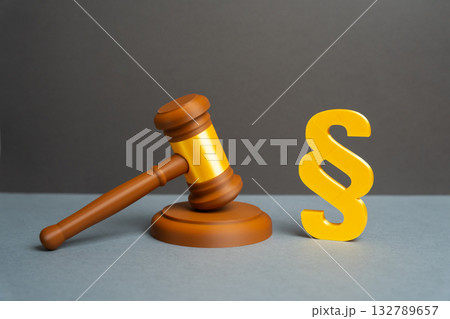 Judge's gavel and paragraph symbol. Laws and legislation. Adoption of laws, acts, and amendments to legislation. Regulation and fiscal. Legislative authority, justice, and government regulation.