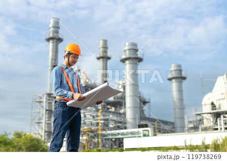 Asian worker power plant factory looking blueprint check construction plan power plant. Engineer wearing safety uniform helmet at energy petrochemical industry.