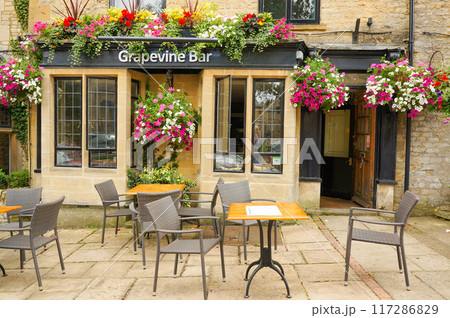 倫敦郊區的里士滿城市景觀:在狹窄後巷的一家商店前排成一排的椅子和桌子