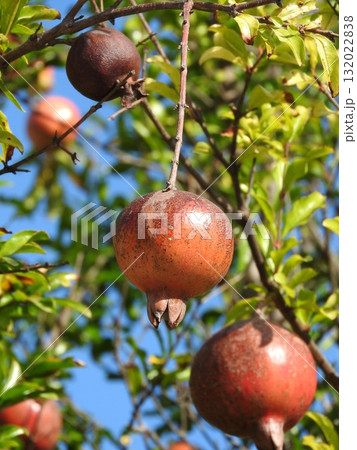 幾顆日本石榴的特寫,其中一顆裂開了,果實灑落出來,背景為灰色