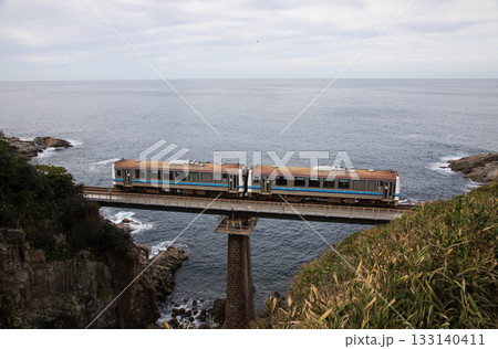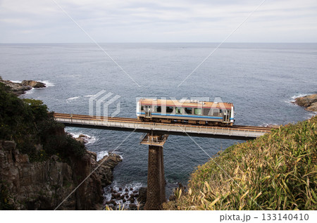 以日本海為背景,穿越青浦大橋的山陰本線電車