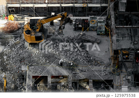 Old orange bricks and broken cement walls. Close-up of construction or repair of a wall.