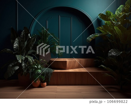 Green podium in modern tropical background for product placement 3d render. AI Generative
