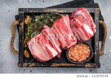 Fresh Raw lamb rib cuts, mutton meat with rib bone in wooden board. grey background. top view