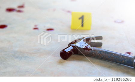 A bloodstained steel hammer lying on a concrete floor, with a blurred yellow marker number 1 and scattered blood drops, symbolizing a violent crime scene under investigation.