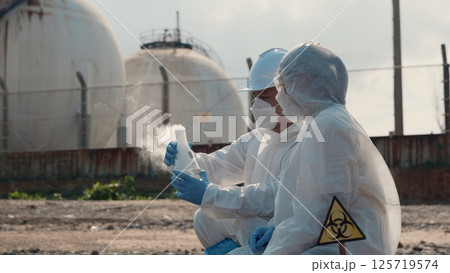 Ecologist sampling water toxic chemicals from river with test tube glass and have white smoke, Biologist wear protective suit and mask collects sample waste water from industrial, problem environment