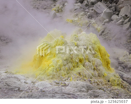 黃色岩石中噴湧而出的蒸汽