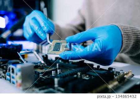 Close-up cropped shot of technician hands applying thermal paste to CPU of computer motherboard, ensuring optimal heat dissipation during maintenance or upgrade service in workshop.