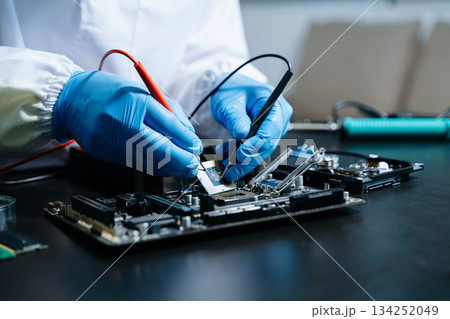 Professional electronics technician repairing computer motherboard in modern lab. Hardware engineering, cybersecurity, data technology, server maintenance