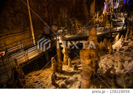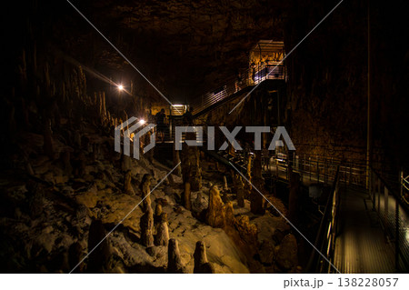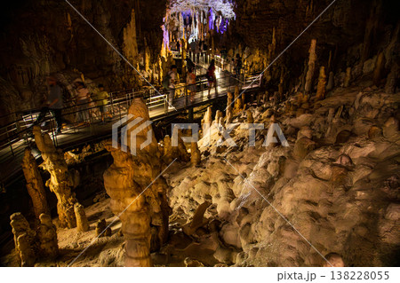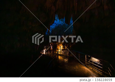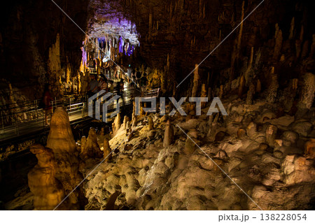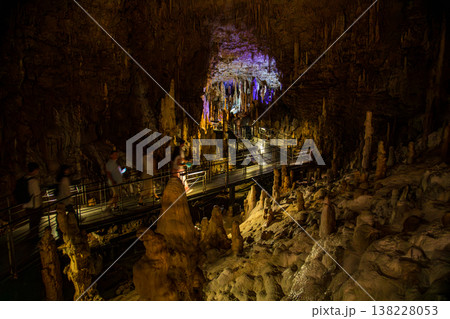 壯麗的鐘乳石與石筍群在紫色與琥珀色燈光交織下,佈滿了整個地底洞穴