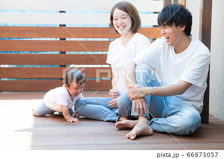 家庭度假放鬆在木甲板上