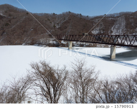 以冬山為背景的野岩鐵道“湯西川橋和結冰的磯里湖”