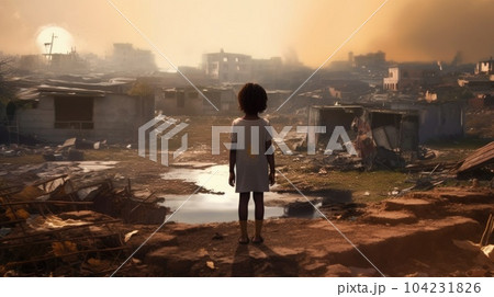 A sad little girl standing in Africa in front of collapse buildings area, natural disaster or war victim. Generative AI AIG32