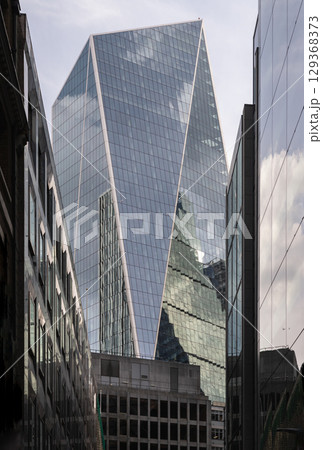 a striking perspective of The Scalpel building, characterized by its sharp, angular, and geometric design, standing as a prominent commercial skyscraper.