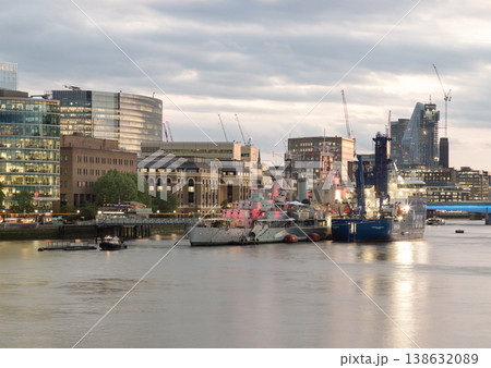 A wide-angle dusk shot of the London South Bank featuring HMS Belfast and adjacent shipping vessels. The image showcases the architectural contrast between historic naval landmarks and the modern City
