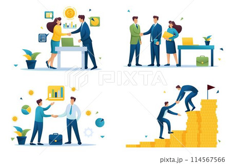 Set of web design on the topic of cooperation between companies, business. Flat 2D