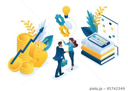 Isometric business financial cooperation between the investor and the creative team. Concept for web design