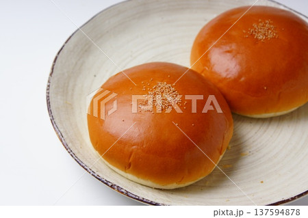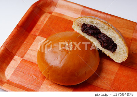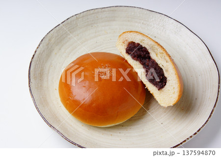 白色背景上的紅豆沙餡豆沙麵包橫切面