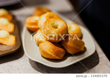 橢圓盤上的金黃迷你甜甜圈造型磅蛋糕