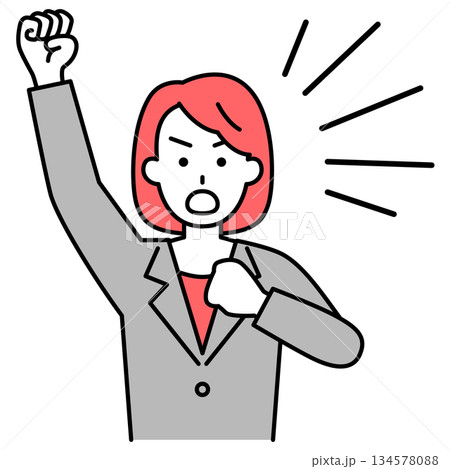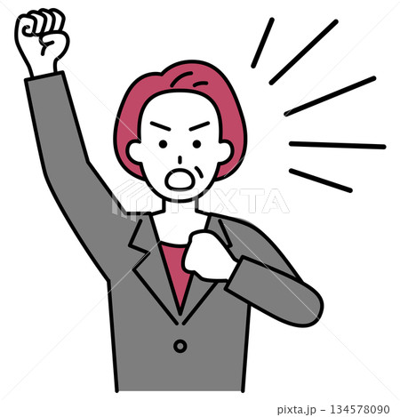 一位身穿西裝的中年婦女舉起拳頭進行抗議。