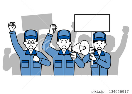 一名身穿背帶褲的男子舉起拳頭抗議。
