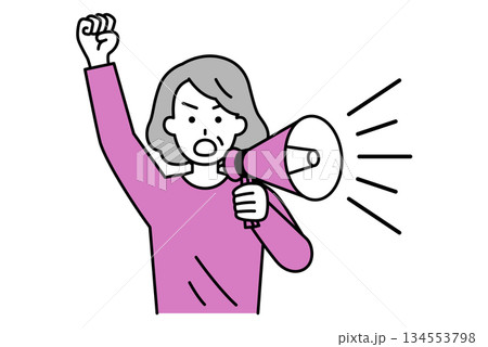 一位身穿西裝的中年婦女拿著擴音器抗議