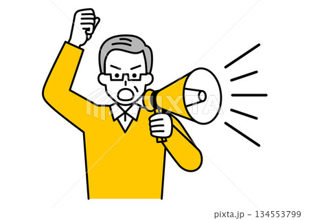 一名身穿西裝的中年男子舉起拳頭抗議。