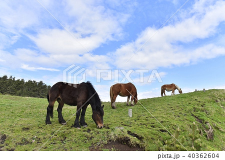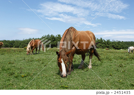 青森縣 藍天新綠草原上的甘龍馬父母和孩子
