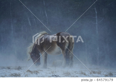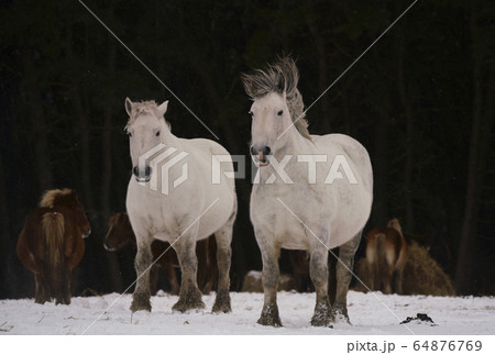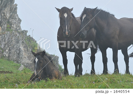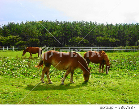 青森縣 藍天新綠草原上的甘龍馬父母和孩子