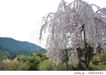 山梨縣韭崎市神山町鍋山 - 櫻花樹沿著河流排列,背景是一座積雪薄發的山峰