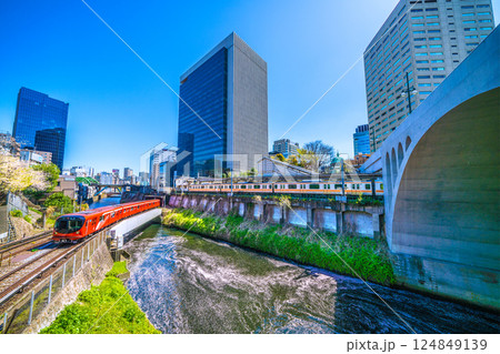 日本東京城市景觀的新景觀。丸之內線2000系、御茶之水站、聖橋。花筏遍布水面