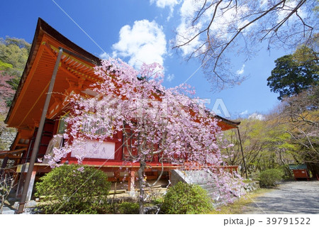 奈良縣櫻井市的南山神社的禮儀大廳,神社大廳,十座三塔和櫻花