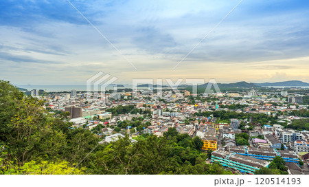 Aerial view of Phuket from Khao Rang hill, highlighting urban and natural scenery under a colorful evening sky.