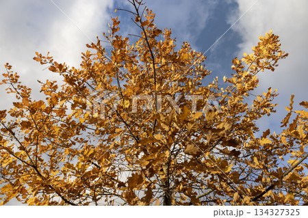 autumn oak foliage against the sky with clouds in early November, beautiful rusty oak foliage in the autumn season in sunny weather