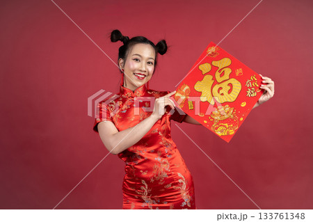 Lucky Chinese girl in traditional dress displaying calligraphy for prosperity.