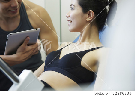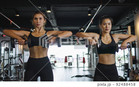 A photo of Thai woman lifting dumbbells with her instructor's help.
