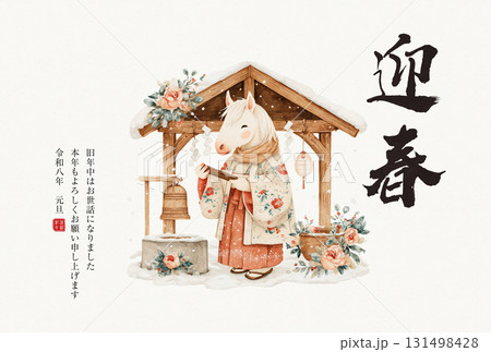 白馬在占卜中得到了好運,他很高興。新年素材。第一次參拜神社。黑白照片。