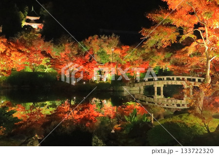 Eikando鮮紅色的秋葉的照亮和池塘的倒影