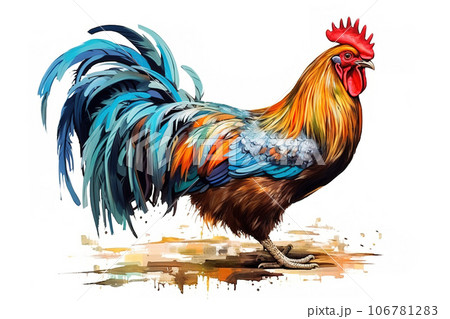 Image of beautiful colorful painting of a rooster. Farm animals. Illustration, Generative AI.